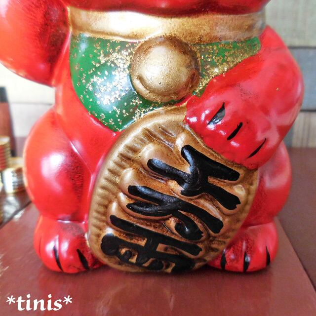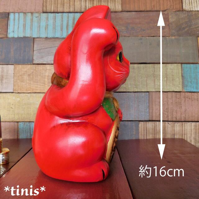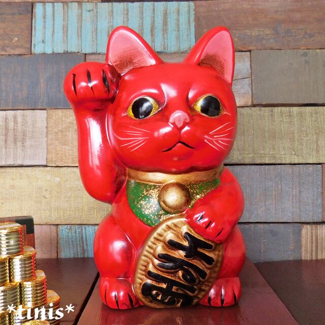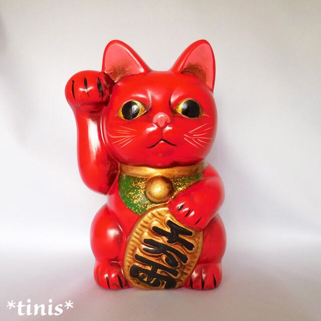 右手を上げていて、レトロな風合いが素敵な赤色の招き猫です。