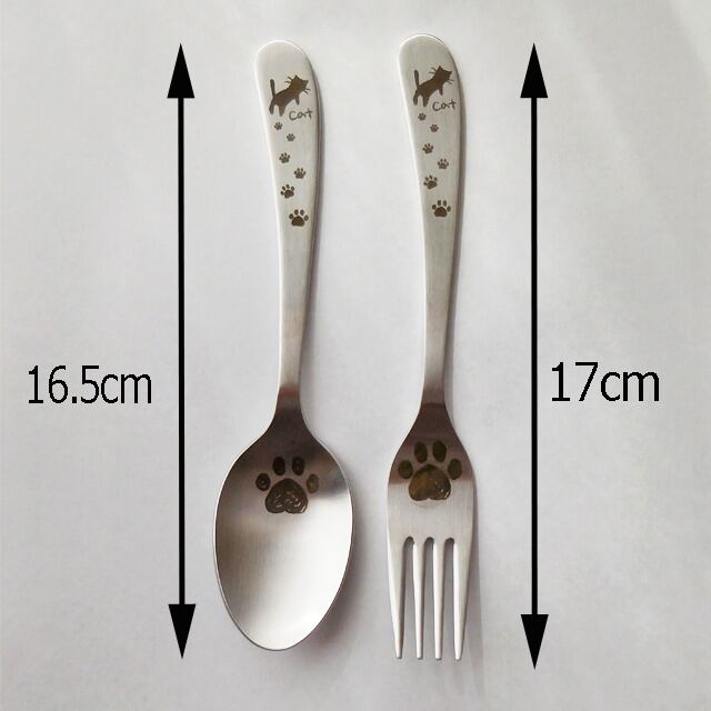 ネコちゃんのイラストが描かれているステンレスのスプーンとフォークです。