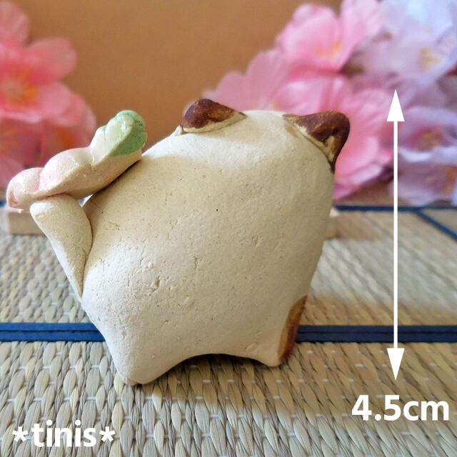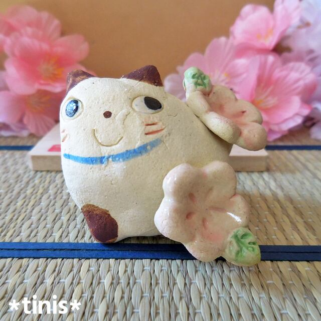 桜の花を纏って、にっこりとした可愛らしいお顔の猫の置物です。