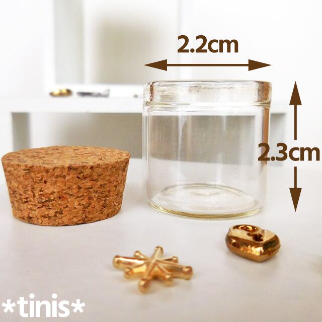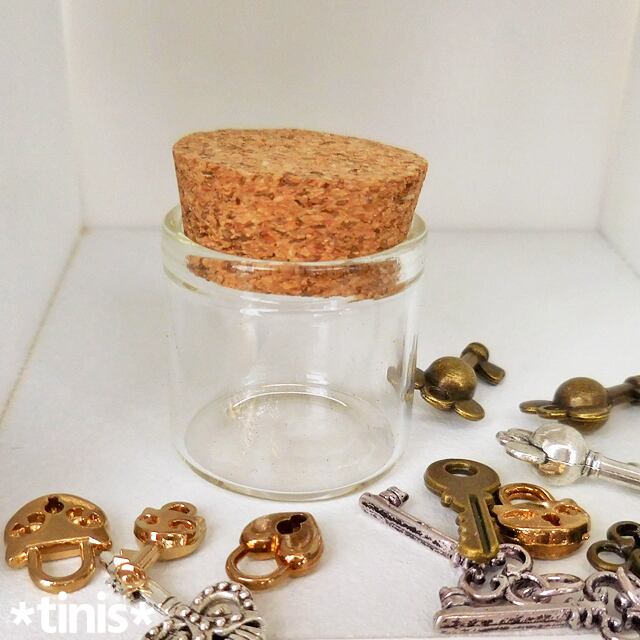 コルクミニボトルはコルクの蓋をした状態の高さは約3センチ、ガラスボトルの内径は約2センチの小さなボトルです。