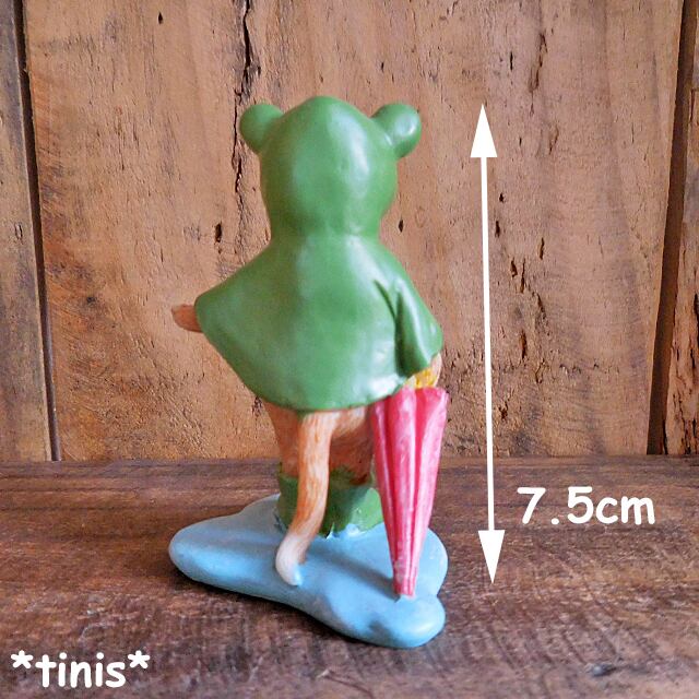 レインコートを着た猫のミニオブジェは高さ約7.5センチの小さな置物です。