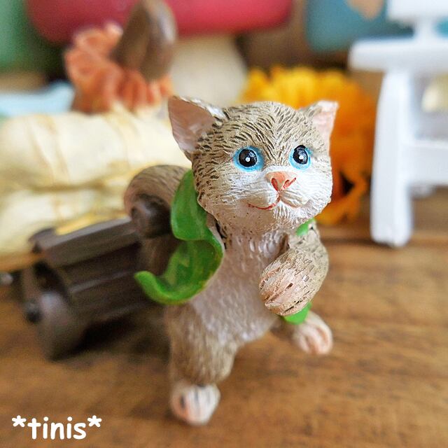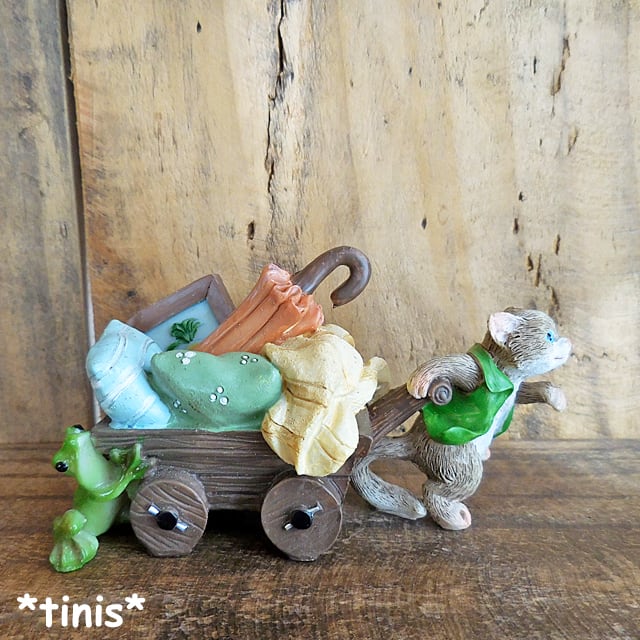猫と蛙と荷車のミニオブジェは高さ約5センチの小さな置物です。