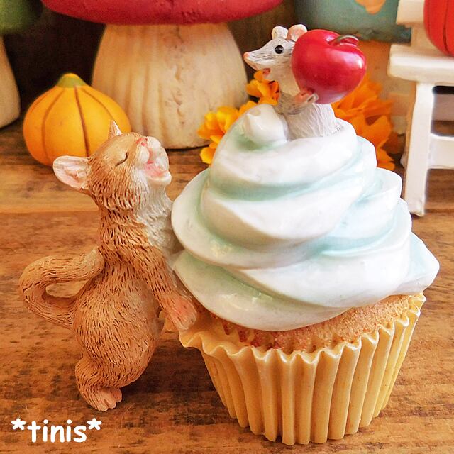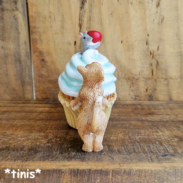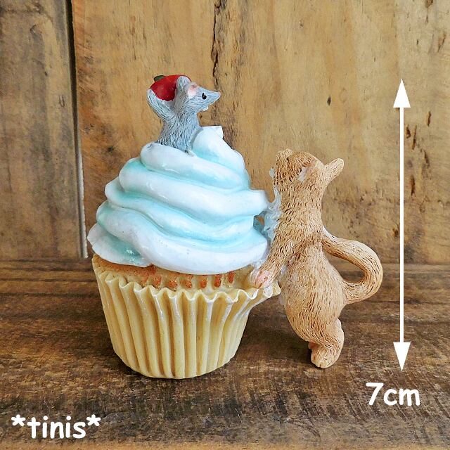 カップケーキと猫とねずみのミニオブジェは高さ約7センチの小さな置物です。
