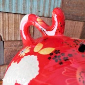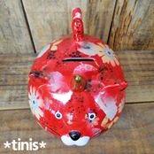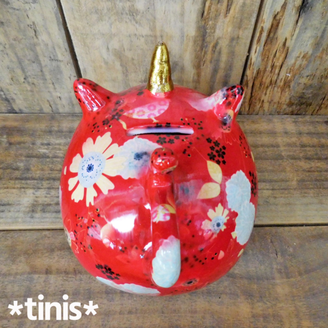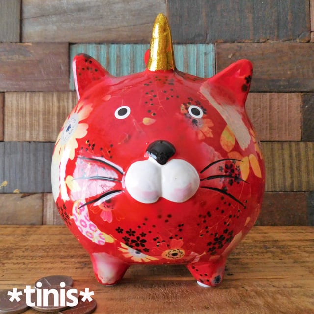 (433) 貯金箱 ネコ 赤猫 花柄 陶器製 東洋石創